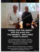 CONCERTS DEL XV FESTIVAL INTERNACIONAL HIVERN–PRIMAVERA DE CALP. “SONGS FOR THE HEART” Dúo PALOMARES – APELLÁNIZ (violí i piano).dijous, 19 Febrer, 2026 - 20:00 to 21:00 |